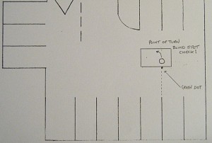 - If it’s safe, handbrake off, fraction up on the clutch and creep back. Look over your right shoulder at the white line you are aiming for (your reference point). Once the green dot looks like it's touching the white line stop. This is your point of turn.